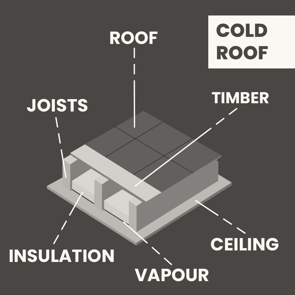 - Another insulation type used for our cold roof system are insulation boards such as Celotex® or Kingspan®. These are dense boards which are also placed in between the joists. For this specific insulation, it requires a cross-ventilated air gap, where it has continuous airflow of at least 50mm above the insulation to the decking.