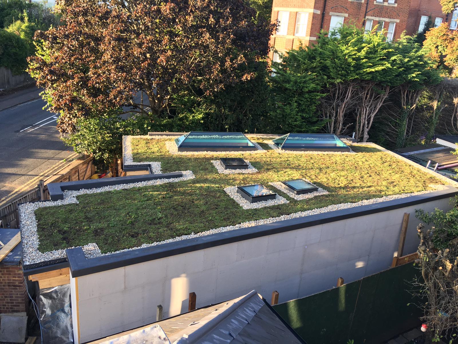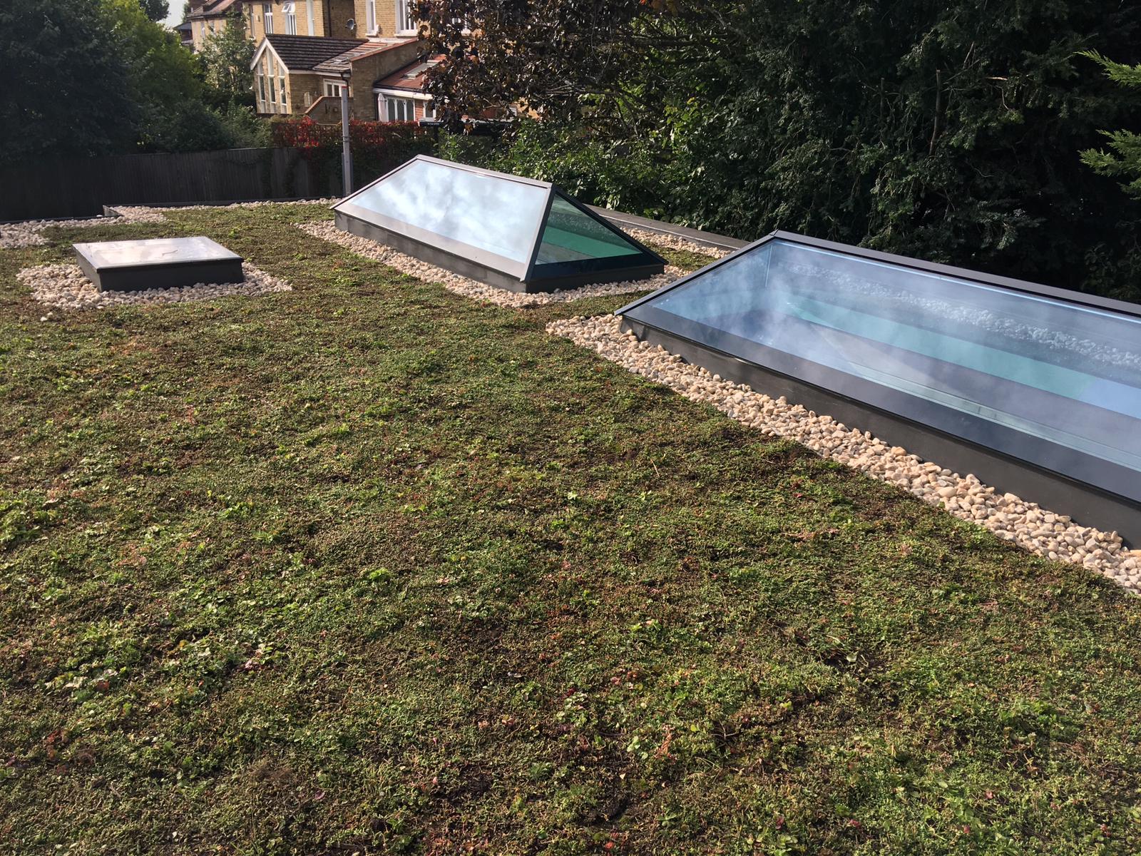 The photographs below display a green roof we completed in Wimbledon. This features a sedum blanket for the main deck, and pebbles to aid water filtration.