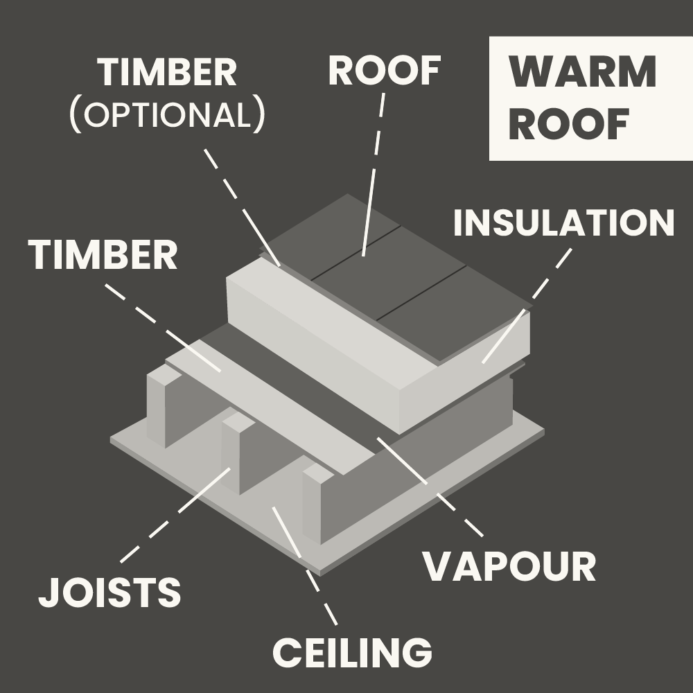 On the diagram it states that timber is optional on a warm roof. This option is only available with the use of the Cure-It® Evo waterproofing system. Polyester resin can be directly applied onto the insulation boards, without the need of osb3 sterling boards.